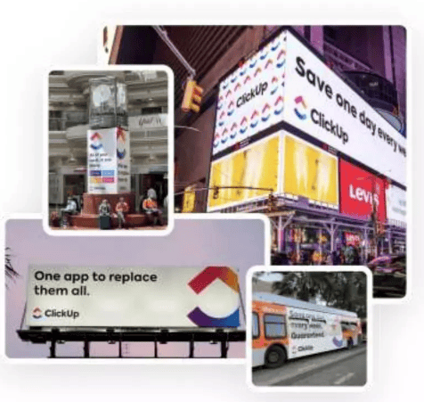 ClickUp understood that strategic branding efforts could create a positive perception of their product and company as a whole. By investing in creative and unconventional marketing campaigns, such as out-of-home advertising like billboards and even a branded bus, ClickUp captured attention and stood out in a crowded market.